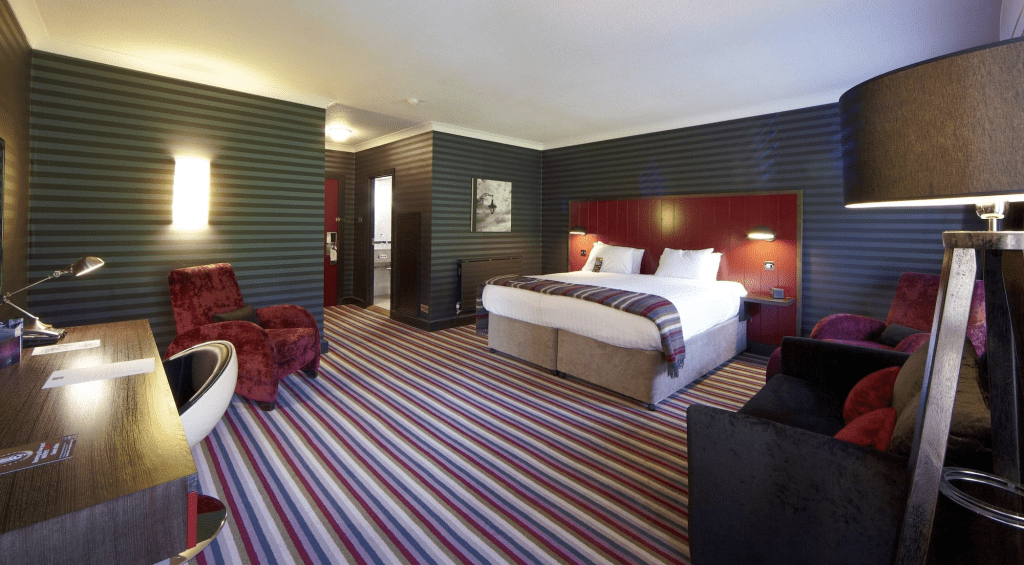 Each room is contemporary in design and extremely comfortable featuring a super-comfy Sealy Posturepedic double bed, ultra modern en-suite bathroom with bath and shower over bath, free access to Health and Fitness, free Wi-Fi, free parking, free access to Vworks Business Club Mon to Fri (if applicable), large flat screen TV, tea and coffee facilities, hairdryer and ironing facilities.