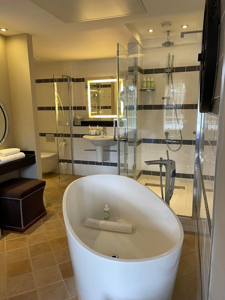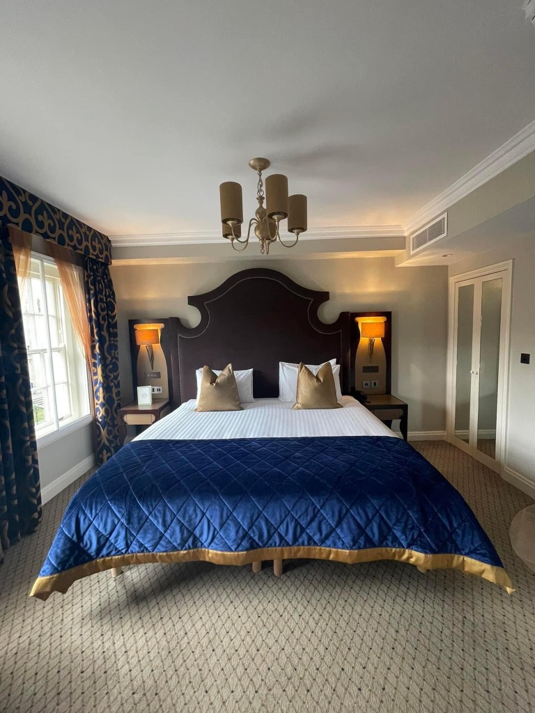 The room has a 6ft King sized extremely comfortable bed, with soft toppers and duvets with goose feather pillows, covered with luxurious Egyptian cotton linen. Additional pillows are included for your comfort and relaxation. This is the room of choice from our editor who has stayed in this room for every stay in Cheltenham.