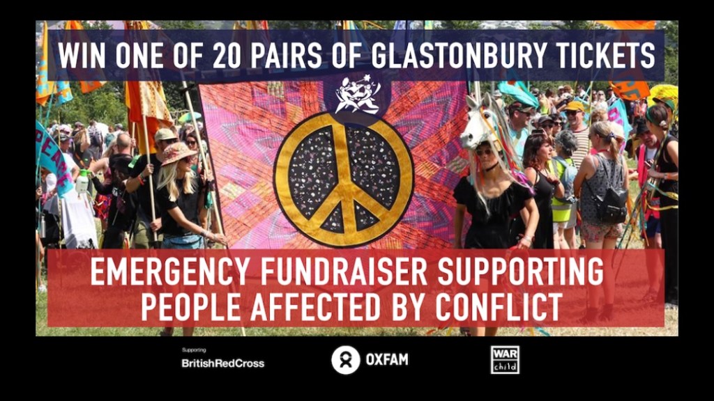 The organisers of the Glastonbury Festival are pleased to offer 20 pairs of tickets to this years festival, to raise emergency funds to support people affected by conflict. Enter the prize draw here.