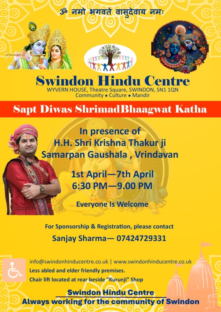 Dear Devotees, Swindon Hindu Centre is pleased to announce that after much public demand, H.H Shri Krishna Thakur jee has agreed to grace Swindon once more with full Sapt Diwas (7 Days) ShrimadBhaagwat Katha. This will be between 1st April – 7th April 2024 every evening 6.30 PM to 9.00 PM.