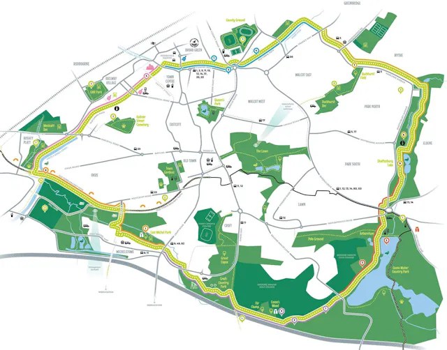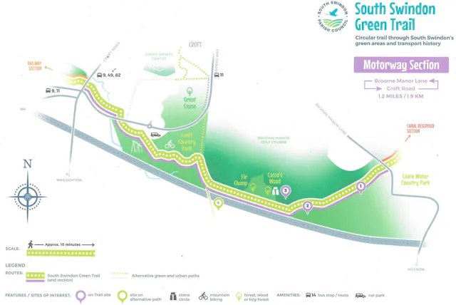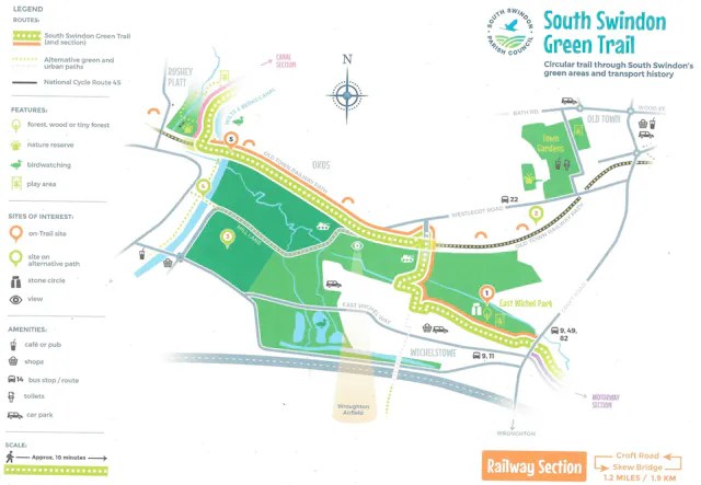 Created in 2022 by South Swindon Parish Council for recreation and conservation, the South Swindon Green Trail roughly follows the boundary of the Parish. The approximately 8 mile / 13 km circular Green Trail goes via Shaftesbury Lake, Coate Water, Croft Wood, East Wichel, Rushey Platt, Cambria Bridge, the Town Centre, Fleming Way, Magic Roundabout and Marlowe Avenue.