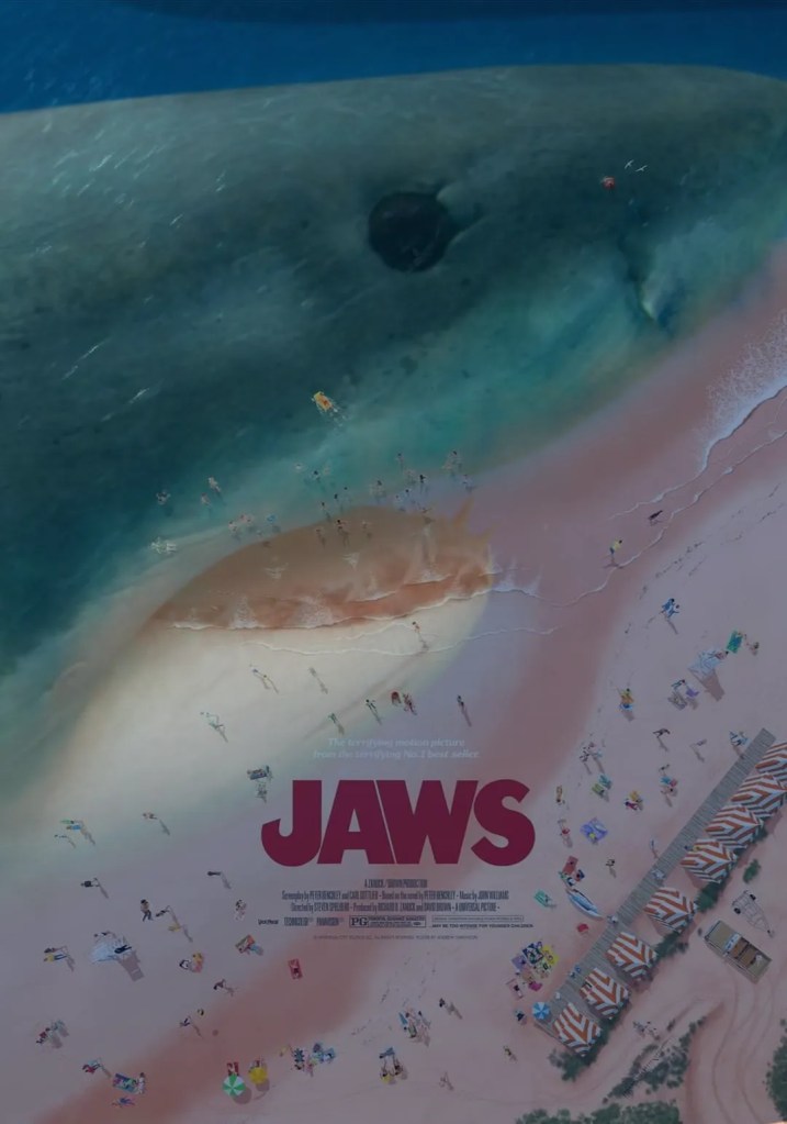 As well as the head of the Great White in view in the birds eye view of the beach meeting the ocean, you can see waves hitting the shore forming its teeth. Some commenting on Easter-Eggs found say they can see Brody sitting on the beach with his wife, about 11 O’Clock from the cabanas, but I can’t see it myself. One commented the Kitner kid is swimming in his float and his mum is face down to the right of Brody.