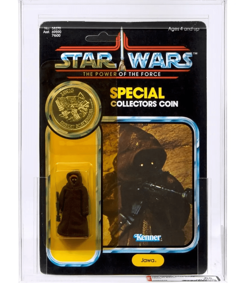 This specific version that you can see in the photo can earn you at least £5,000, potentially could sell much more, depending on the condition and if it is still in its box. When this version of the Caped Jawa was released in 1978, its cape was made out of vinyl. This was before the Kenner company decided the cape looked too cheap and switched the vinyl to cloth, which makes it a pretty rare item.
