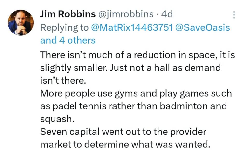 Jim Robbins, leader of SBC publicly stated on social media platform X (formerly Twitter) that there would be very little change to the iconic leisure centre by saying: “There isn’t much of a reduction in space, it is slightly smaller. Just not a hall as demanded isn’t there”. It’s clear from aerial images of the Oasis, that if the sports hall is demolished, it won’t be slightly smaller, it will be around 50% smaller. When will Jim Robbins finally come out with the truth and clarity to the people of Swindon?