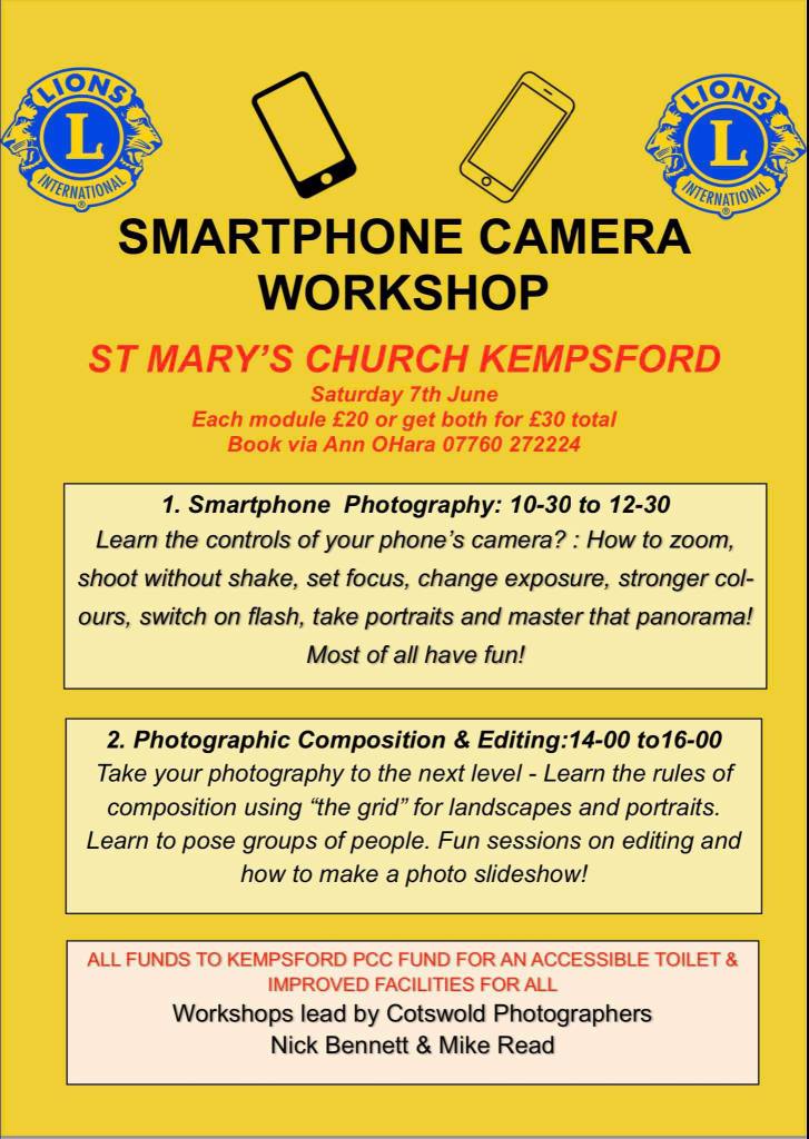 Photographers from the Lechlade Photographers Club are to put on a day of photography workshops, focusing on mobile phone photography in support of raising funds for St Marys Church in Kempsford to install a much needed toilet that will be accessible for all, along with a kitchenette and an overhaul of the heating to make it more eco friendly.