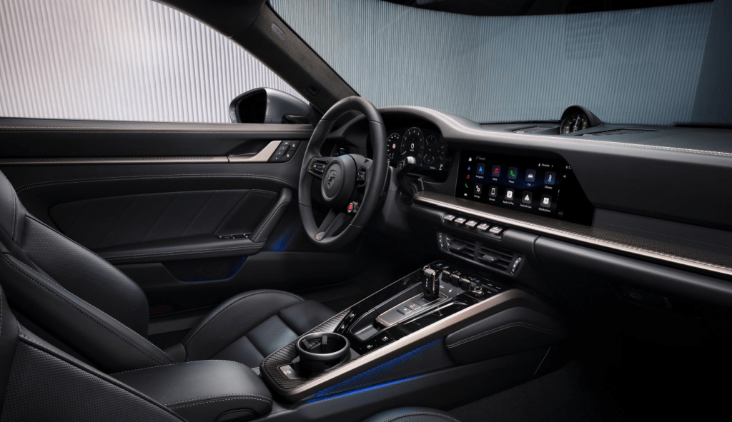 In the interior, Adaptive 18-way Sports Seats Plus with memory function and “turbo S” lettering on the headrests are used ex works. The Turbo S-specific embossing on the seat surfaces and door panels is a reinterpretation of the design features of the first 911 Turbo 930. The folding lightweight sports bucket seat familiar from the 911 GT3 is available as an option for the coupé.