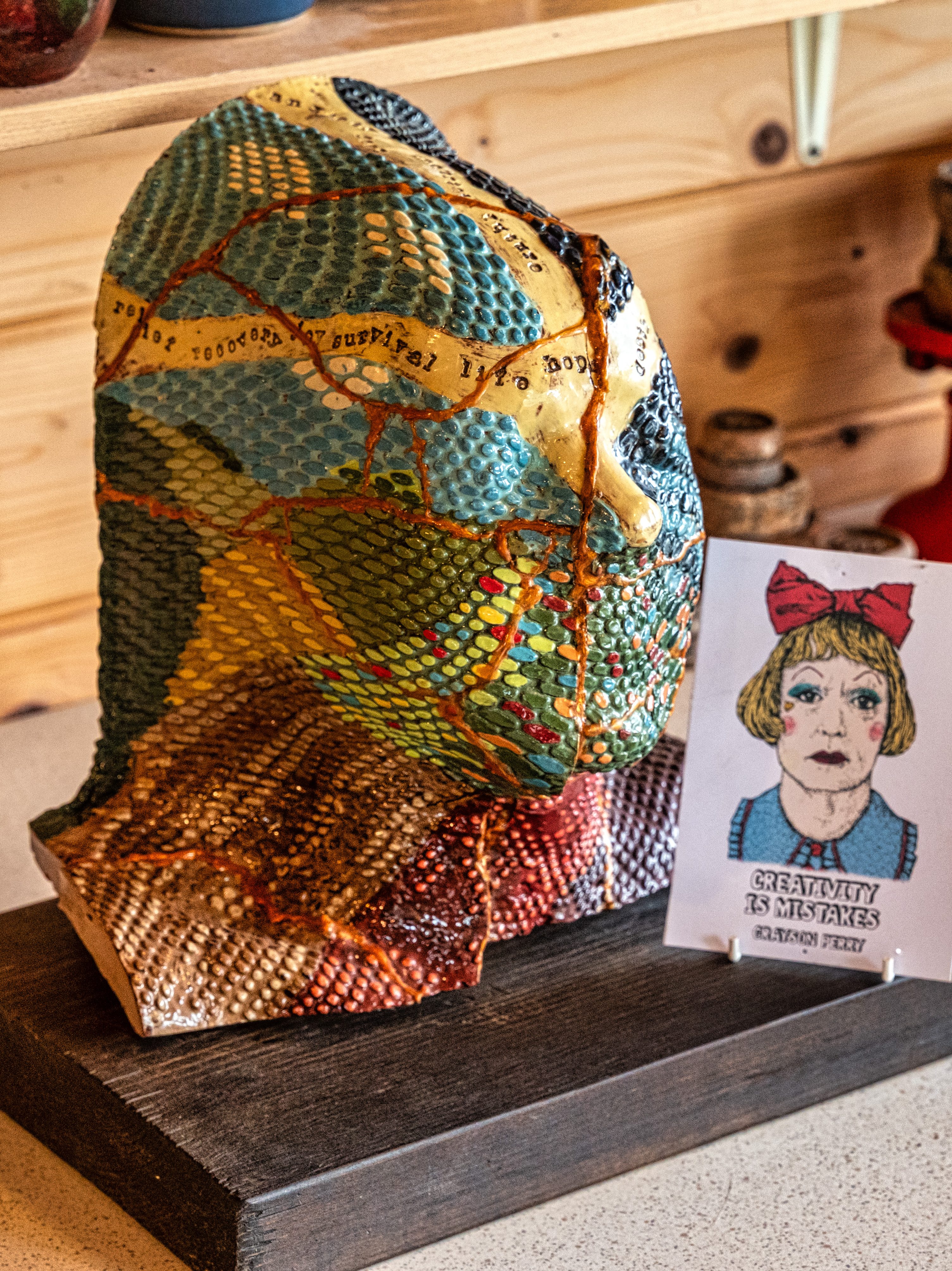 Unfortunately, a disastrous kiln accident meant the piece needed repair, so they used the Japanese “Kintsugi” technique where cracks are repaired with gold. It symbolises how something so broken can be mended and still be beautiful and precious! It was submitted for consideration for Grayson Perry’s Covid Art Club exhibition in Manchester, alongside work from Anthony Gormley (The Angel of the North). Adrian and Susan’s piece entitled ‘It’s not just time that heals’, beat over 10,000 entrants! Ironically, Grayson Perry got Covid, so they didn’t get to meet him in person at the Private View! Susan says “Covid, like cancer, is a journey. The road to recovery can be difficult. We need the support of family, friends and the NHS within a landscape that promotes healing. After all, it’s not just time that heals!”
