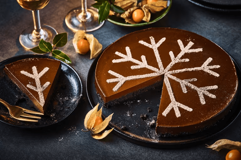 This rich vegan torte features an exquisitely smooth dark chocolate ganache on a crunchy cocoa biscuit base, hand-dusted with a festive snowflake for extra-stylish slicing. Use by date guaranteed until 27 Dec.