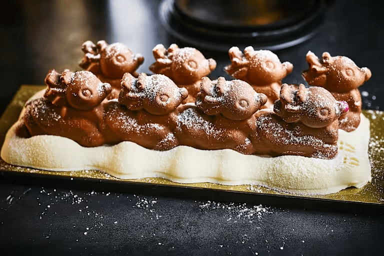 Dark and milk chocolate mousse reindeer filled with salted caramel, on a white chocolate mousse base with cookie and wafer pieces. Use by date guaranteed until 27 Dec.