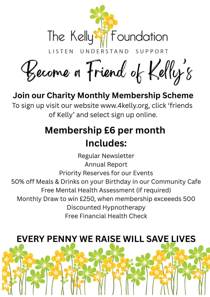 You wont only be giving to a fantastic local cause, but you will also receive a regular newsletter, 50% off meals & drinks, entry to a monthly draw to win £250, priority reserves for Kelly’s Events and a FREE mental health assessment if needed, and so much more!