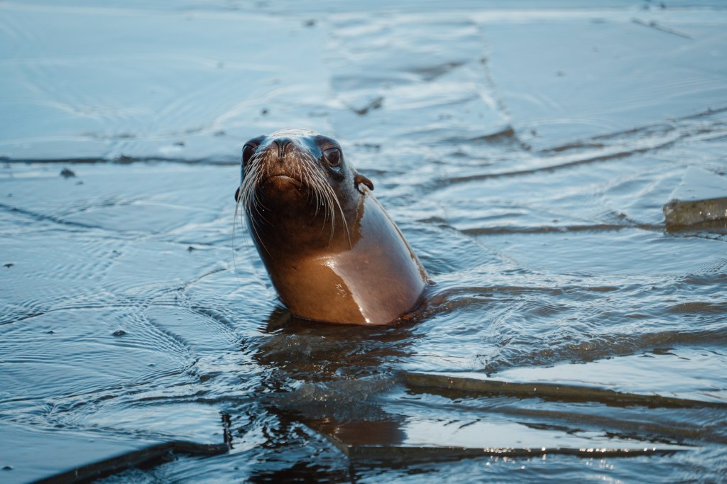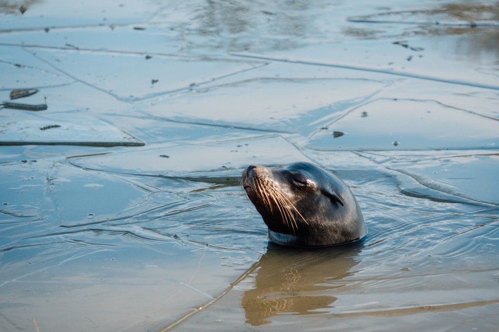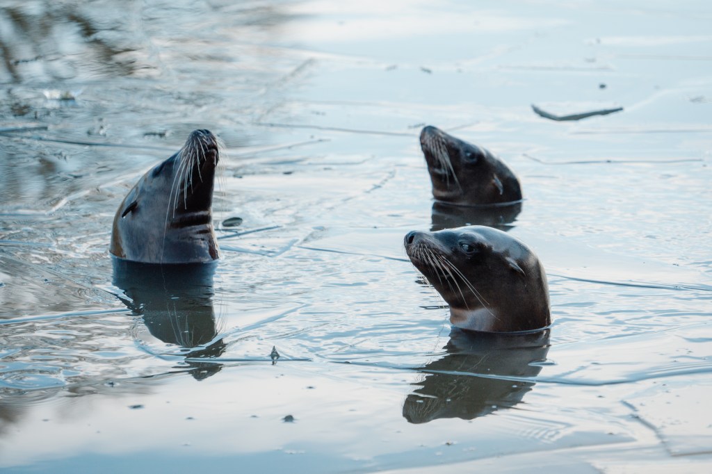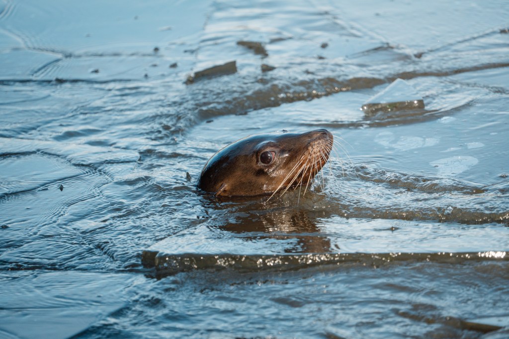 The raft of Californian sea lions has been swimming beneath the icy surface, before popping their heads up to break through the sheets of ice and reach the surface. These behaviours are examples of their natural instincts, as in the wild this species’ range reaches the icy waters of the Alaskan coast.