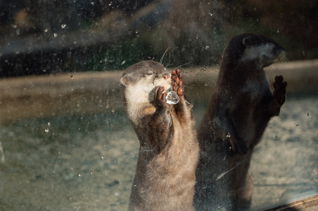 In Jungle Kingdom, a pair of Asian short clawed otters have been walking on their usual stream, as well as playing with chunks of ice in their characteristic finger-like digits.