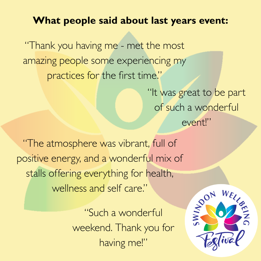 Swindon Wellbeing Festival is welcoming and inclusive; suitable for newcomers to wellness or those wanting to explore in a supportive community environment.