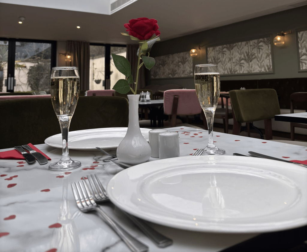 The bar is a lovely relaxed place to have a romantic drink for Valentines where you can sample their fantastic range of Gins as well as a wide range of drinks to celebrate the most romantic day of the year in style before moving into the dining area for a tantalising, tastebud tingling romantic meal.