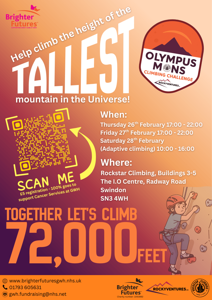 Thursday 26th February is the deadline to take part in the coolest charity event in the universe! If you are free Thursday 26th February, or Friday 27th February, and fancy a bit of a challenge then why not register to take part in the Olympus Mons Climbing Challenge at Rockstar Climbing & Fitness Swindon, in support of Brighter Futures, the Great Western Hospital Charity.
