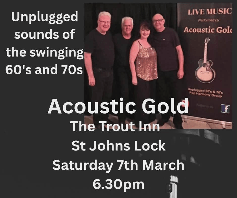 To kick off our music programme for 2026. we have the fabulous Acoustic Gold playing live here on Saturday 7th March. They will entertain you with sounds of the 60’s and 70’s…….and who knows, you might feel the urge to have a dance or two!