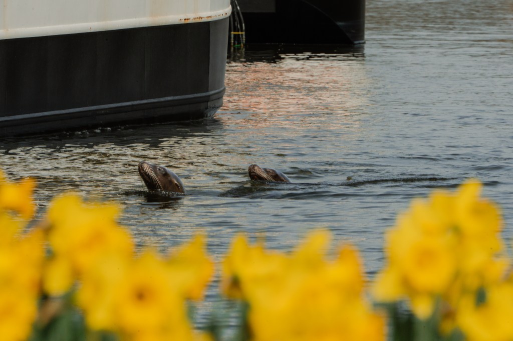 The sea lions can be seen leaping through the water of Half Mile Pond, whose banks are filled with spring daffodil blooms.