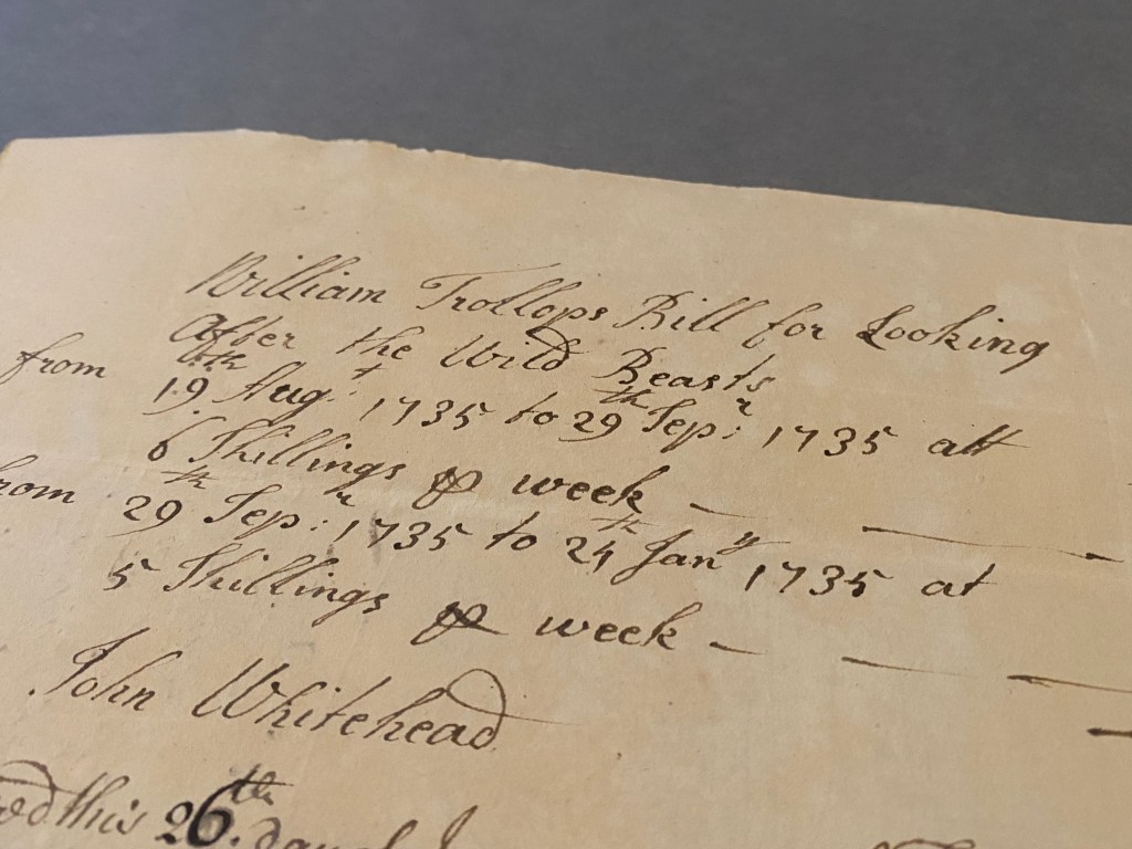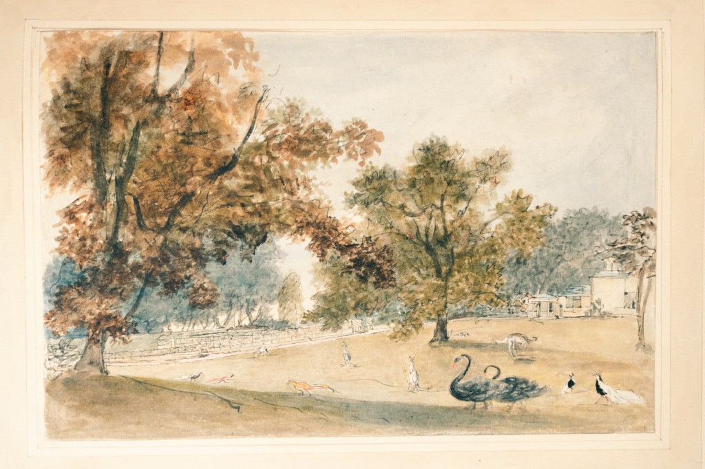 “The exhibition includes documents demonstrating the presence of a variety of animals in these menageries – from wolves and bears to mandrills (then known as ‘man-tigers’) and kangaroos. There were also exchanges with the royal menagerie at Kew, and even a visit from King George III and Queen Charlotte in 1789.
