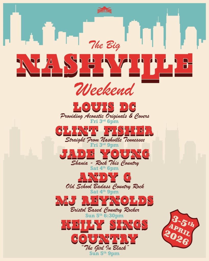 We’ve got Louis DC, Clint Fisher, Jade Young, Andy G, MJ Reynolds, and Kelly Sings Country (In that order) – we’re bringing a full weekend of non-stop country music to The Honky Tonk!
