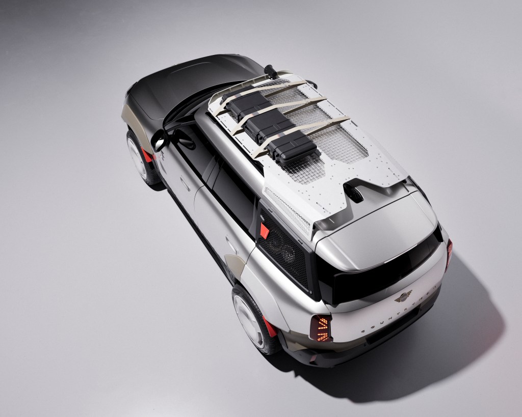 The roof rack consists of three laser-cut and folded aluminium plates, complemented by an integrated stainless-steel mesh as an open surface. This construction visually references the design language of speaker covers, creating a connection between roof, side profile and overall vehicle design – turning the roof rack into an integral design element.